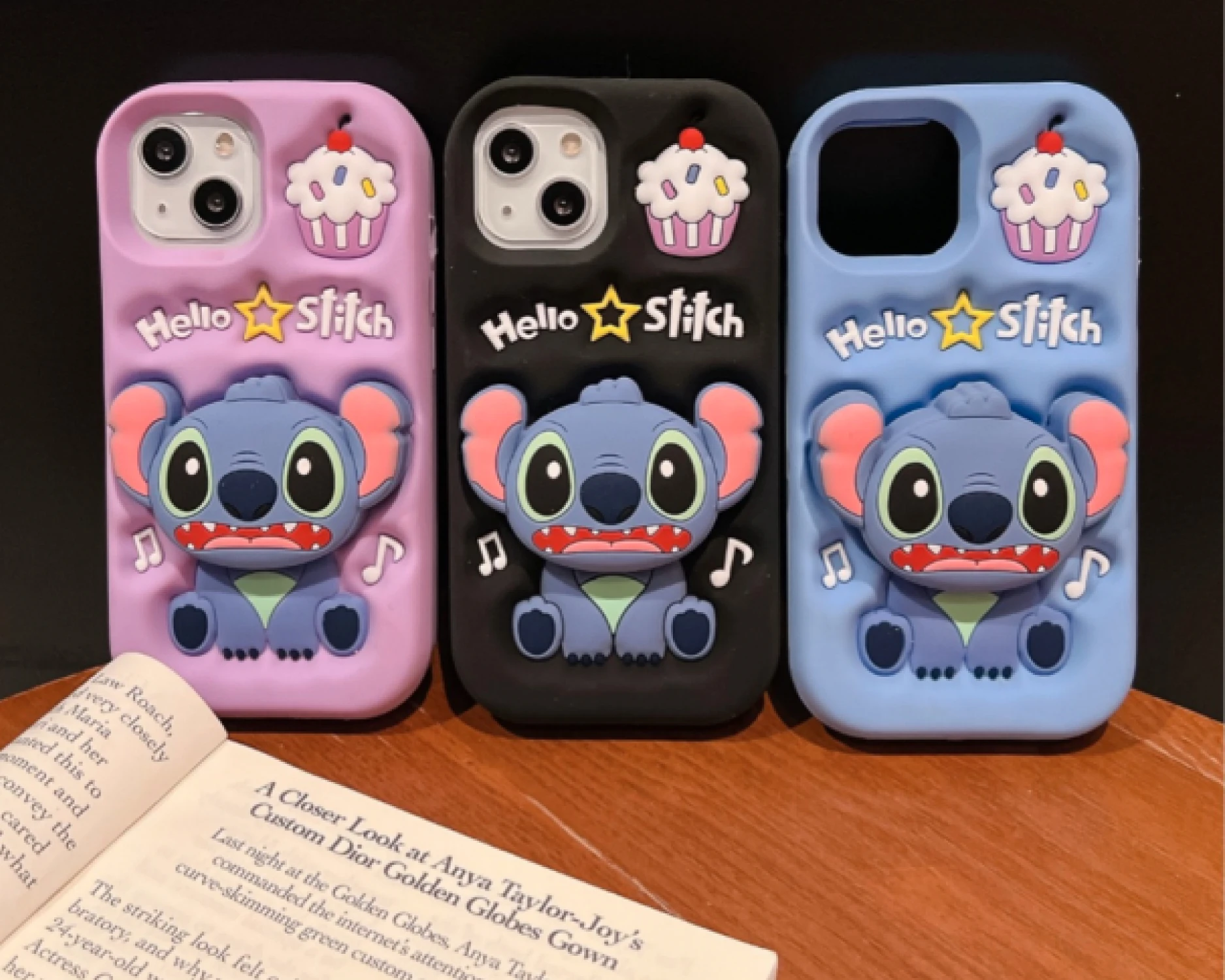 Estas fundas están diseñadas para los fans del personaje Stitch y quienes buscan un accesorio que combine protección, personalidad y diseño kawaii. Cada funda incluye un personaje en relieve 3D con expresión alegre, acompañado de ilustraciones de cupcakes, notas musicales y estrellas. El texto “Hello ★ Stich” en la parte superior añade un toque juguetón y reconocible.