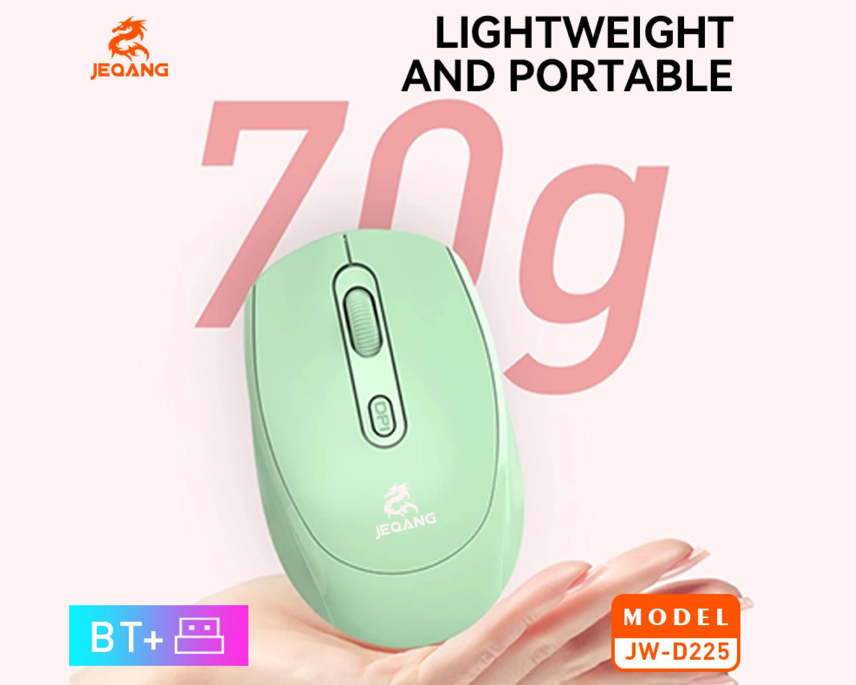 🖱️🔁 JW-D228 – Mouse Inalámbrico Dual Mode (Bluetooth + 2.4G) Jeqang | Diseño Ergonómico, Precisión Óptica y Estilo ModernoConectividad flexible, comodidad duradera y rendimiento confiable para oficina, estudio o uso personal El JW-D228 de Jeqang es un mouse inalámbrico con doble modo de conexión: Bluetooth y 2.4GHz vía receptor USB. Su diseño ergonómico y silencioso lo hace ideal para entornos profesionales o domésticos. Disponible en varios colores, este modelo combina estética con funcionalidad, y su sensor óptico de alta precisión lo convierte en una herramienta versátil para cualquier tarea. ✨ Beneficios del producto