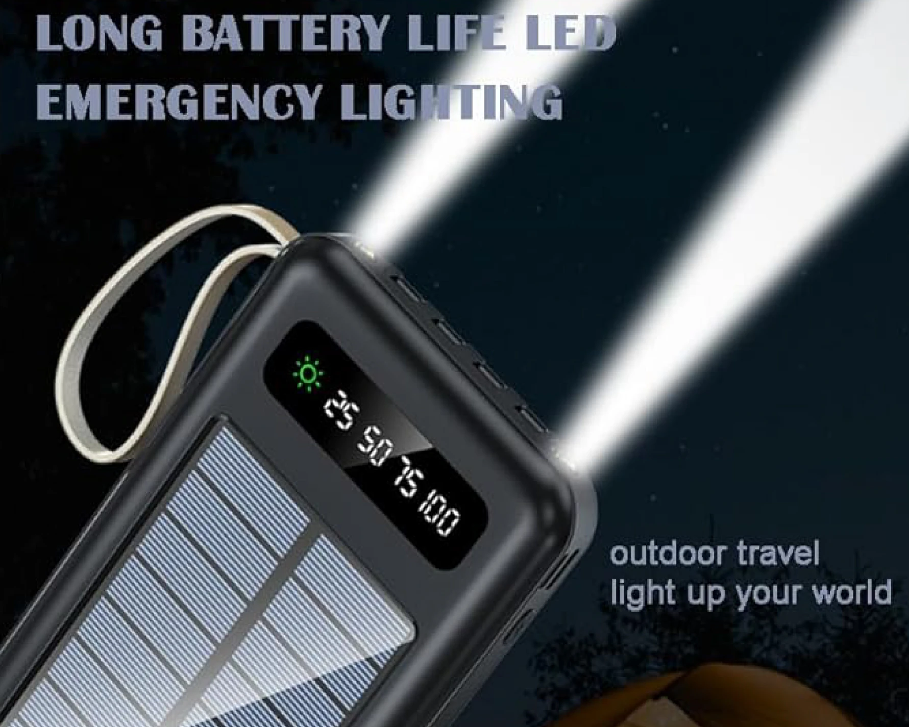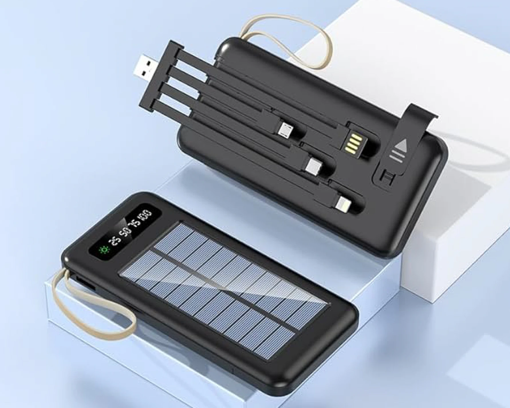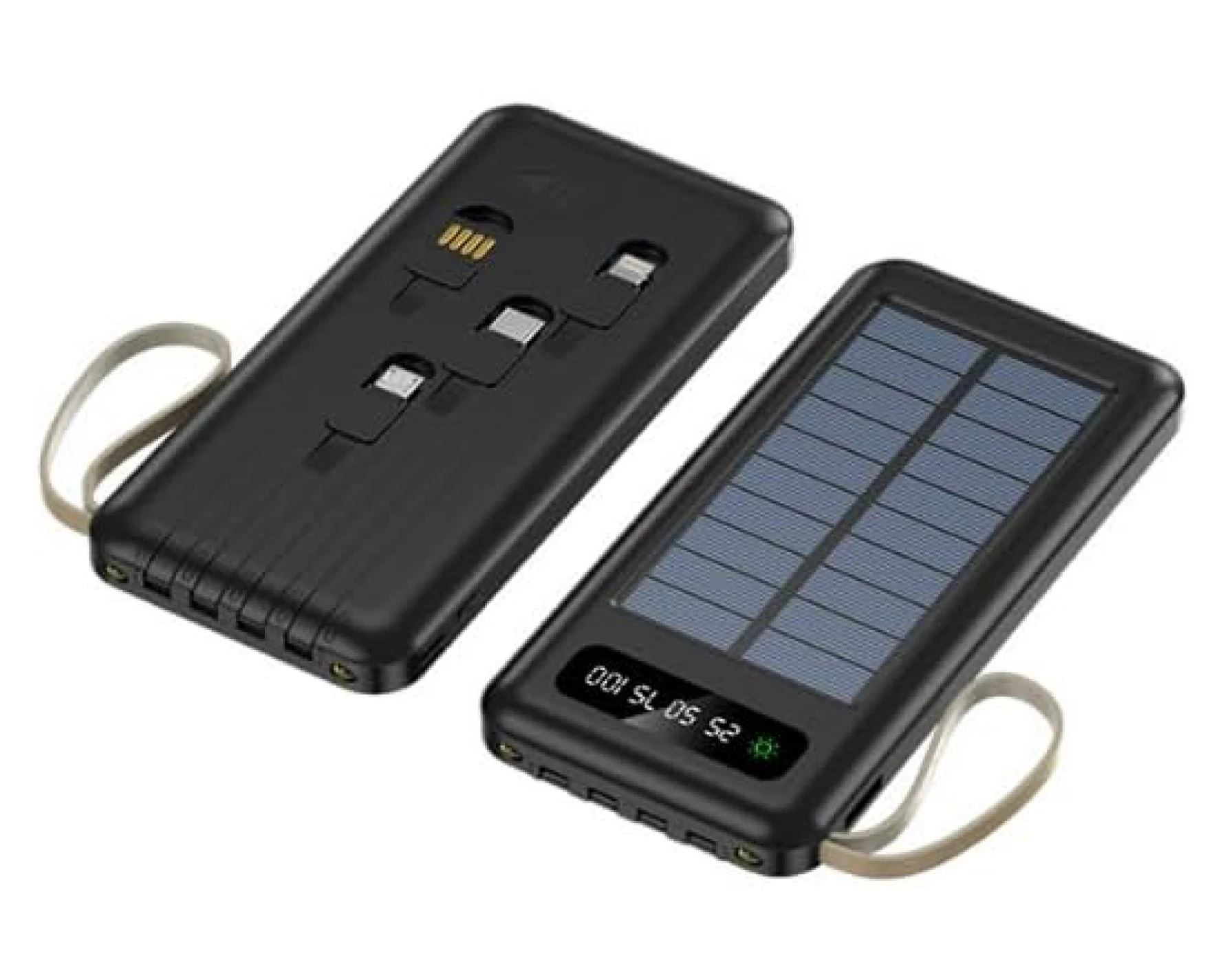 🔋☀️ Power Bank Solar 12,000mAh | Linterna LED, Cables Integrados y Pantalla DigitalDiseñado para quienes necesitan energía confiable en movimiento, con funciones prácticas y diseño compacto Este modelo de Power Bank solar de 12,000mAh incluye un panel solar funcional, linterna LED doble, y cuatro cables integrados (USB-C, Lightning, Micro-USB y USB-A), lo que lo hace compatible con la mayoría de smartphones y dispositivos electrónicos. Su pantalla digital LED muestra el nivel de carga en porcentajes (25%, 50%, 75%, 100%) y el estado de carga solar. Algunos modelos también incluyen gancho para mochila y modos de luz SOS. ✨ Beneficios del producto