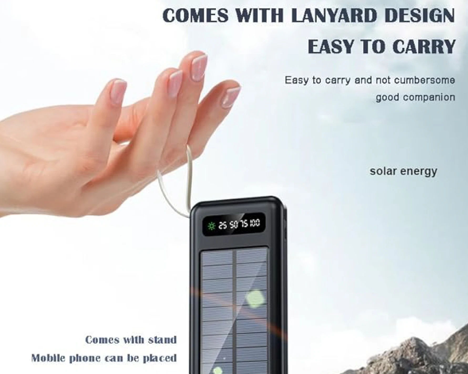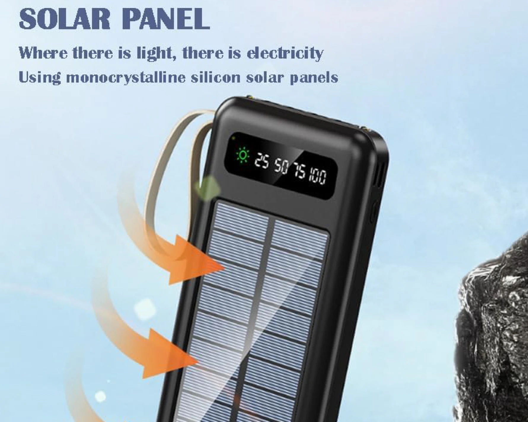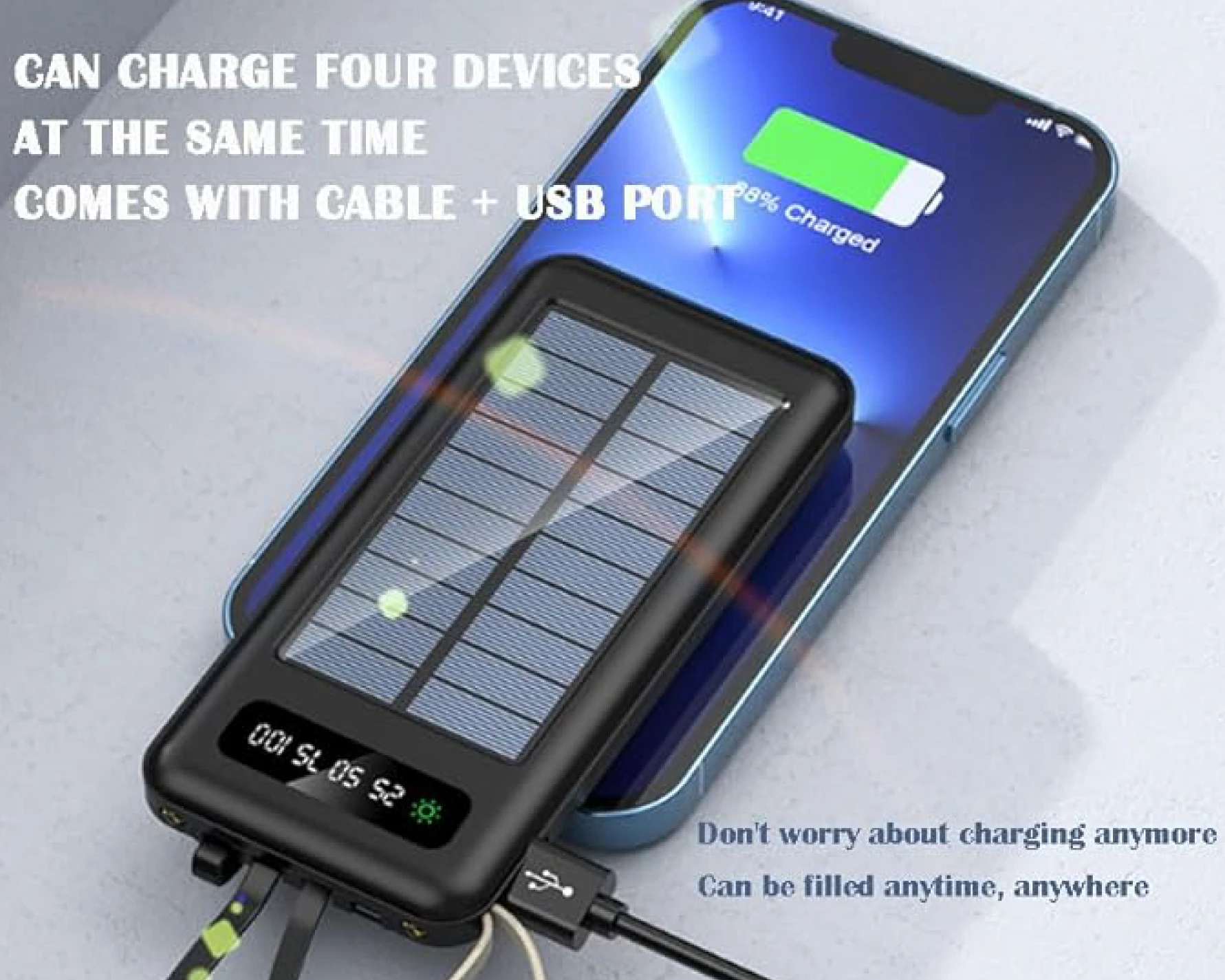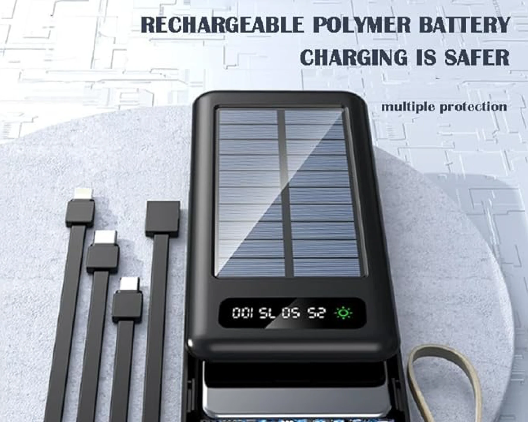 🔋☀️ Power Bank Solar 12,000mAh | Linterna LED, Cables Integrados y Pantalla DigitalDiseñado para quienes necesitan energía confiable en movimiento, con funciones prácticas y diseño compacto Este modelo de Power Bank solar de 12,000mAh incluye un panel solar funcional, linterna LED doble, y cuatro cables integrados (USB-C, Lightning, Micro-USB y USB-A), lo que lo hace compatible con la mayoría de smartphones y dispositivos electrónicos. Su pantalla digital LED muestra el nivel de carga en porcentajes (25%, 50%, 75%, 100%) y el estado de carga solar. Algunos modelos también incluyen gancho para mochila y modos de luz SOS. ✨ Beneficios del producto