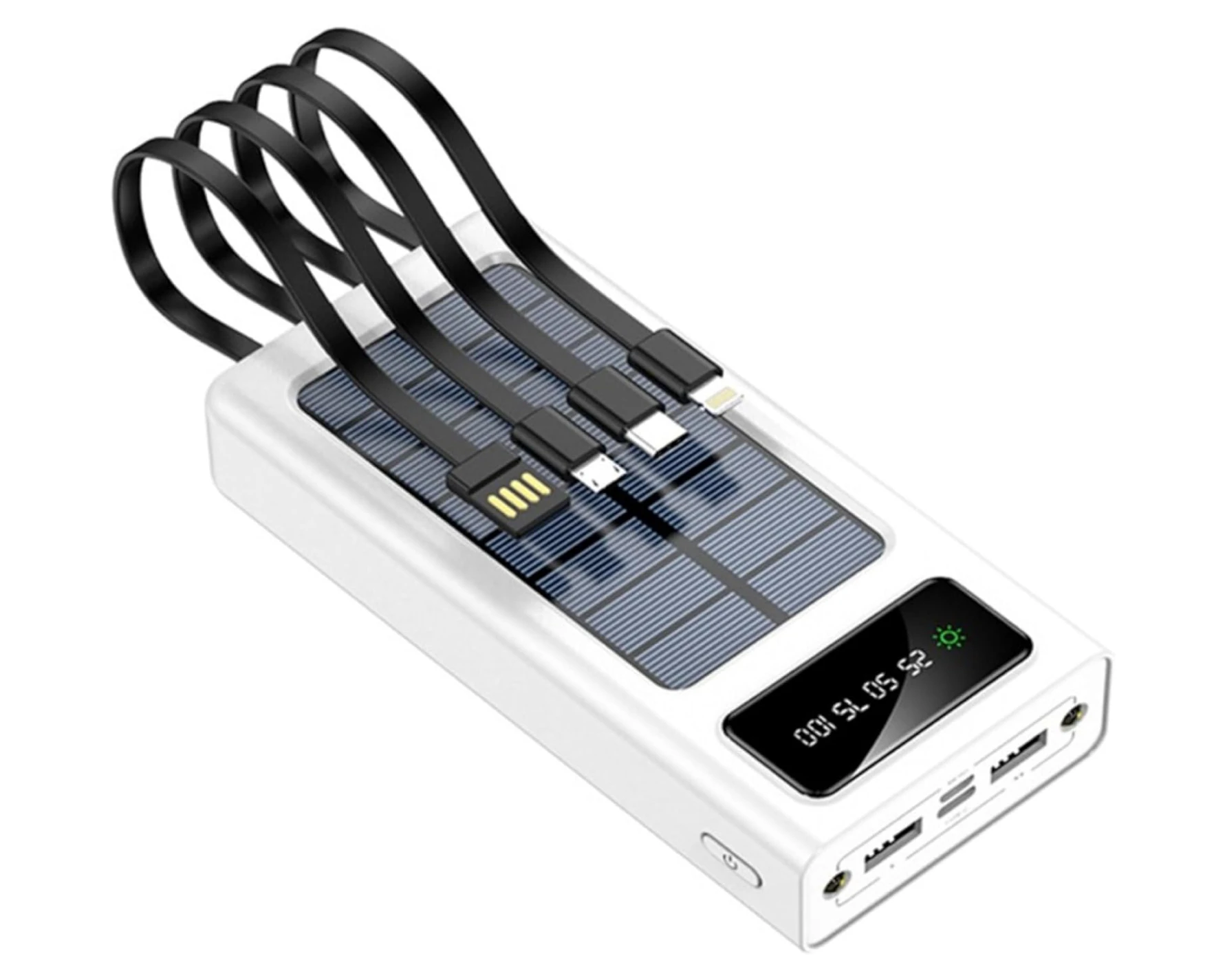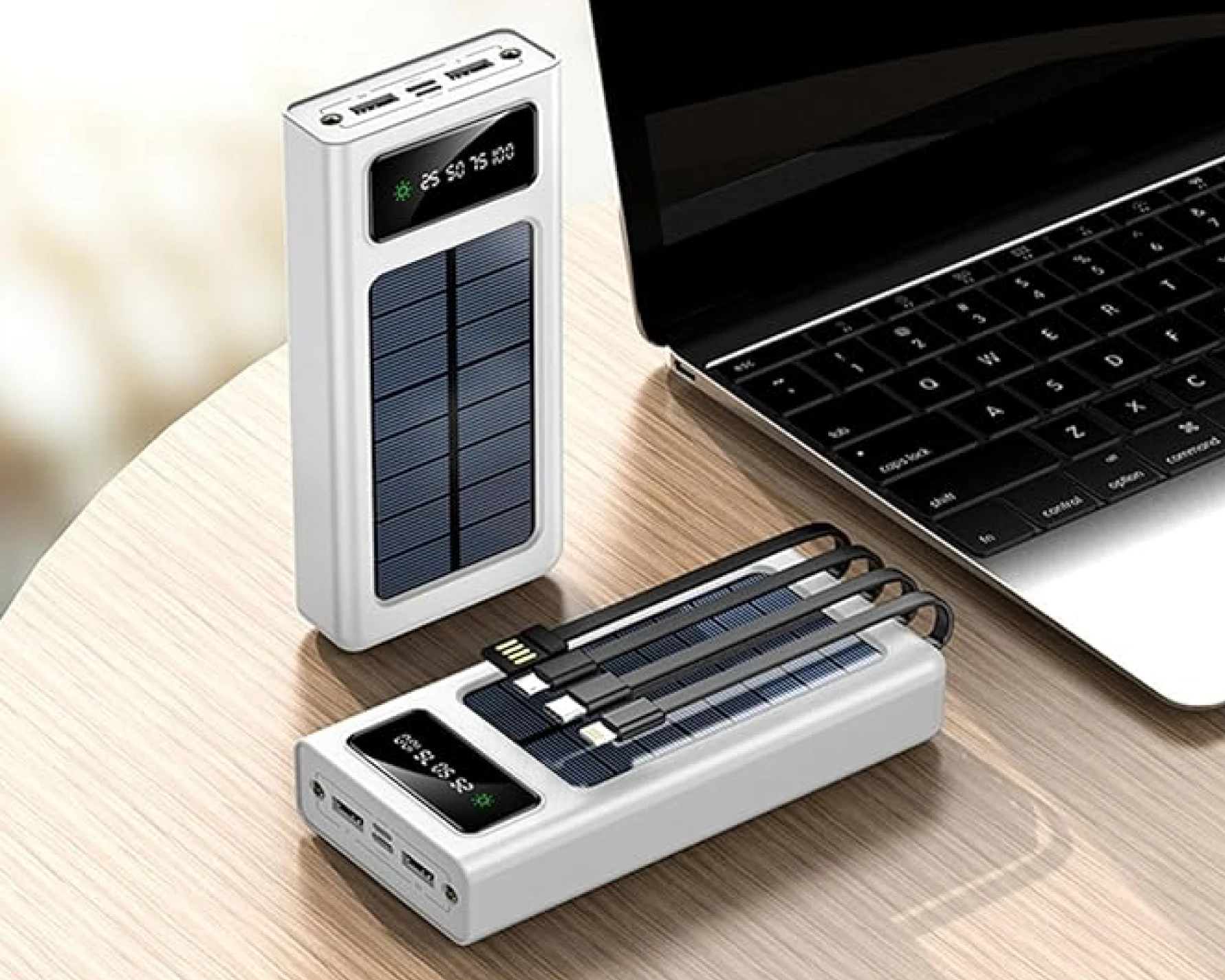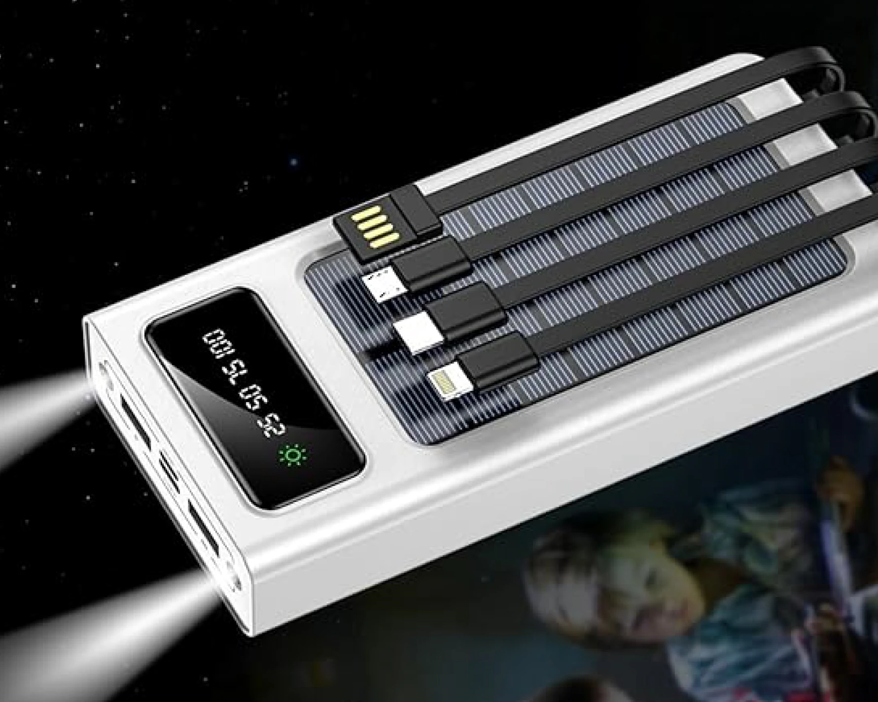 🔋☀️ Power Bank Solar 20,000mAh | Cables Integrados, Panel Solar y Pantalla LEDDiseñado para viajeros, aventureros y usuarios que necesitan energía confiable sin depender de enchufes Este modelo de Power Bank solar de 20,000mAh combina una batería de alta capacidad con un panel solar funcional que permite recargarlo con luz natural. Su diseño incluye cuatro cables integrados (USB-A, Micro-USB, USB-C y Lightning), lo que lo hace compatible con la mayoría de smartphones y dispositivos electrónicos. La pantalla LED muestra el nivel de carga en porcentajes (25%, 50%, 75%, 100%) y el estado de carga solar. ✨ Beneficios del producto