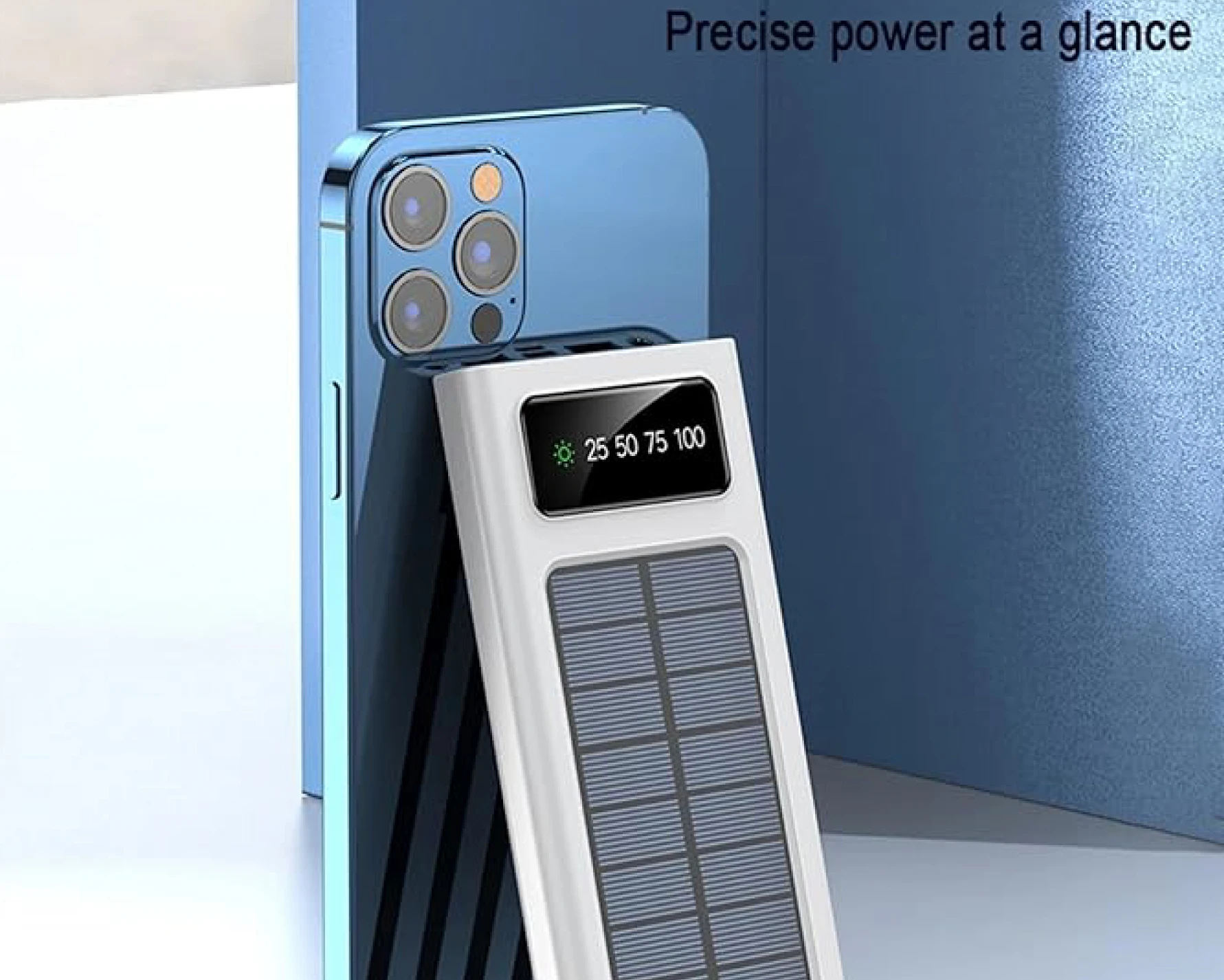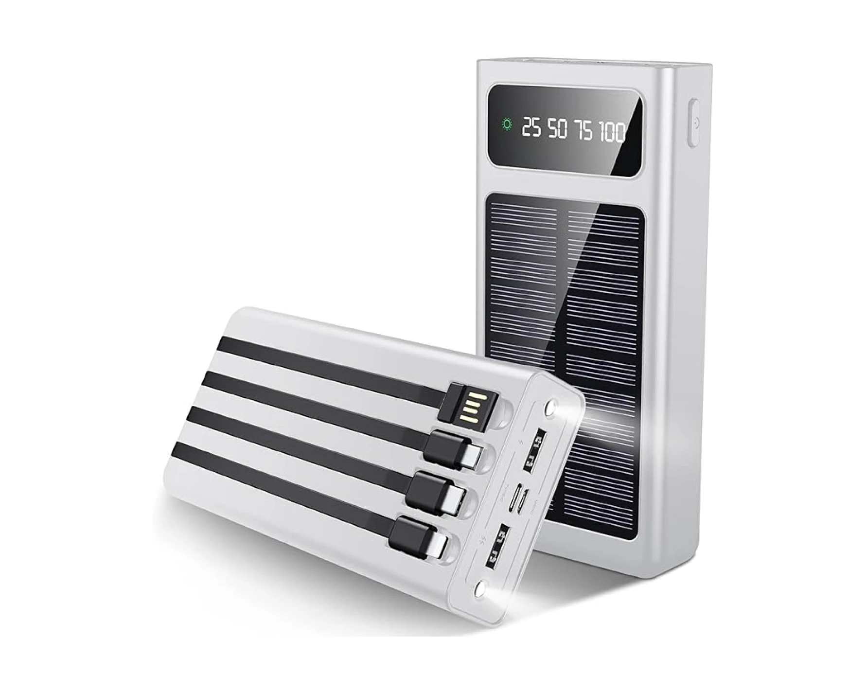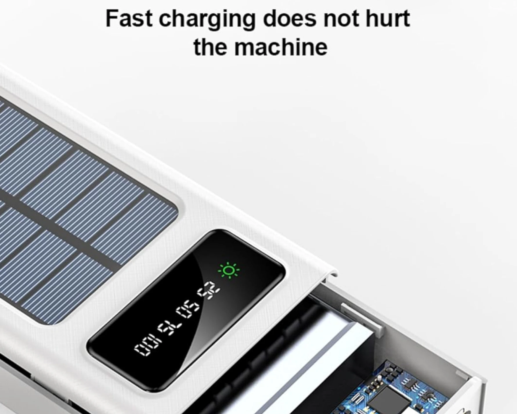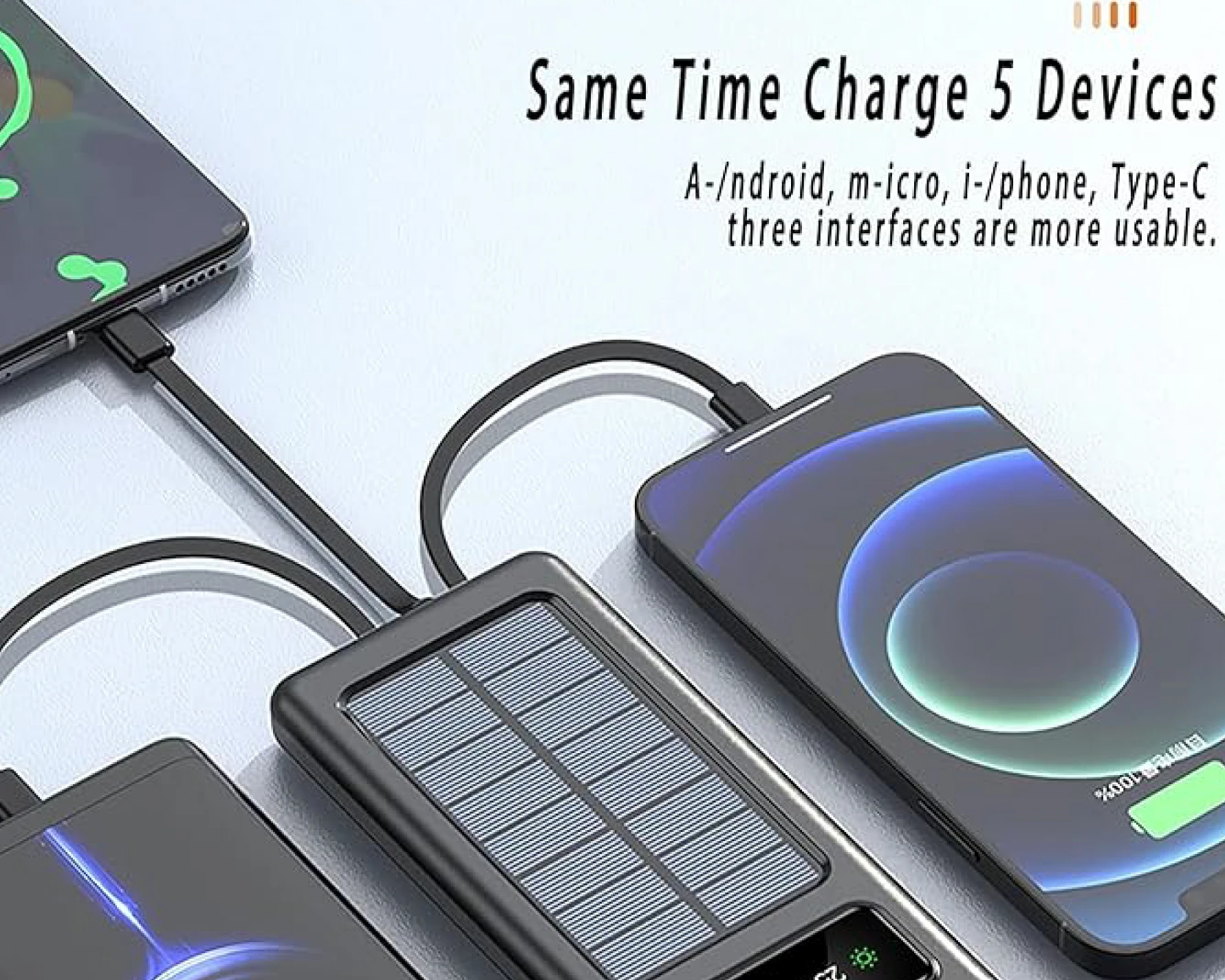 🔋☀️ Power Bank Solar 20,000mAh | Cables Integrados, Panel Solar y Pantalla LEDDiseñado para viajeros, aventureros y usuarios que necesitan energía confiable sin depender de enchufes Este modelo de Power Bank solar de 20,000mAh combina una batería de alta capacidad con un panel solar funcional que permite recargarlo con luz natural. Su diseño incluye cuatro cables integrados (USB-A, Micro-USB, USB-C y Lightning), lo que lo hace compatible con la mayoría de smartphones y dispositivos electrónicos. La pantalla LED muestra el nivel de carga en porcentajes (25%, 50%, 75%, 100%) y el estado de carga solar. ✨ Beneficios del producto