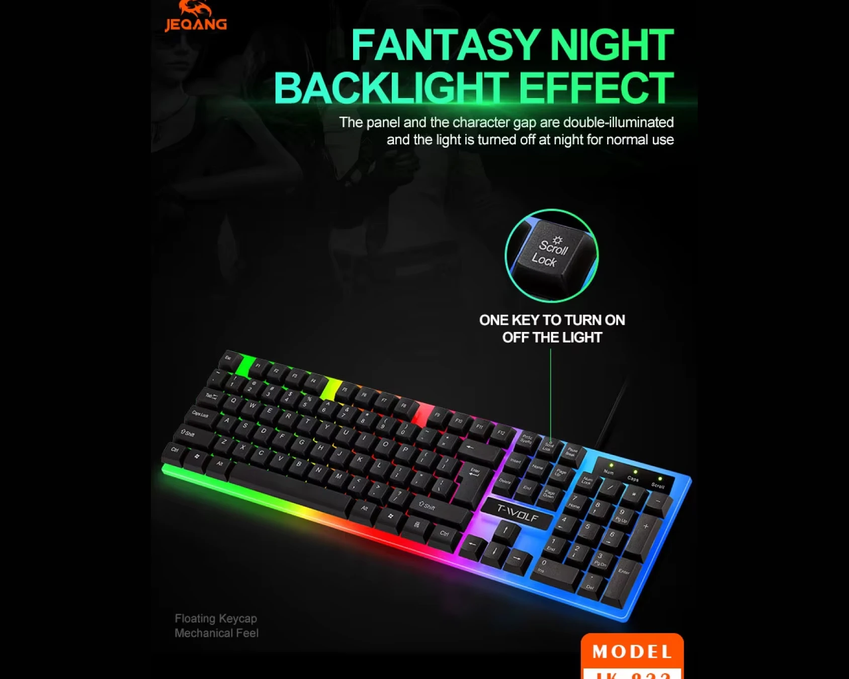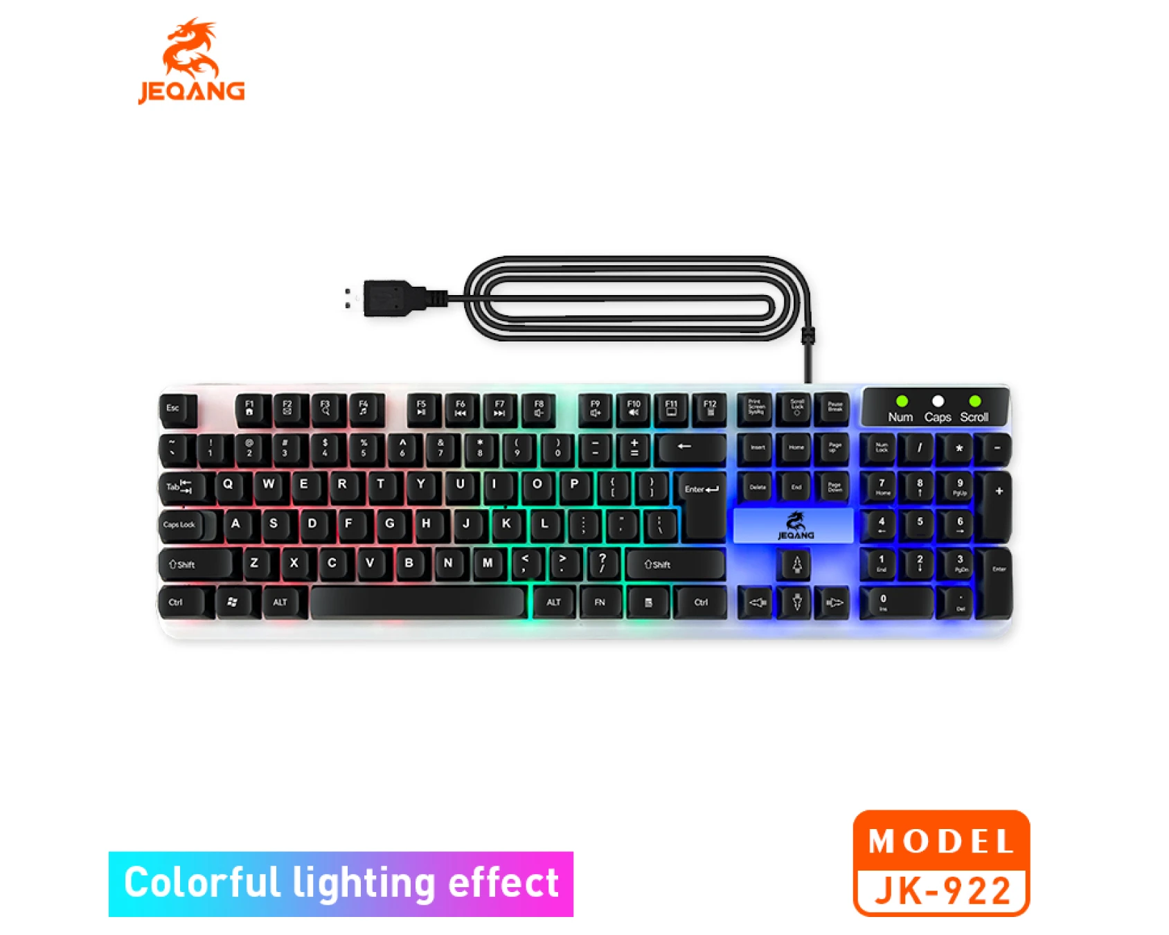 ⌨️⚡ JK-922 THE STORM – Teclado Gamer con Retroiluminación RGB y Tecnología Óptica | Precisión, Estilo y Resistencia para Jugadores IntensosDiseñado para quienes exigen velocidad, durabilidad y una estética impactante en su setup El JK-922 es un teclado gamer alámbrico con tecnología óptica, que ofrece una respuesta ultra rápida y una vida útil superior a los teclados mecánicos tradicionales. Su diseño flotante con retroiluminación RGB dinámica crea una atmósfera envolvente para sesiones de juego intensas. Además, su estructura resistente y compatibilidad universal lo hacen ideal para jugadores, streamers y usuarios exigentes. ✨ Beneficios del producto