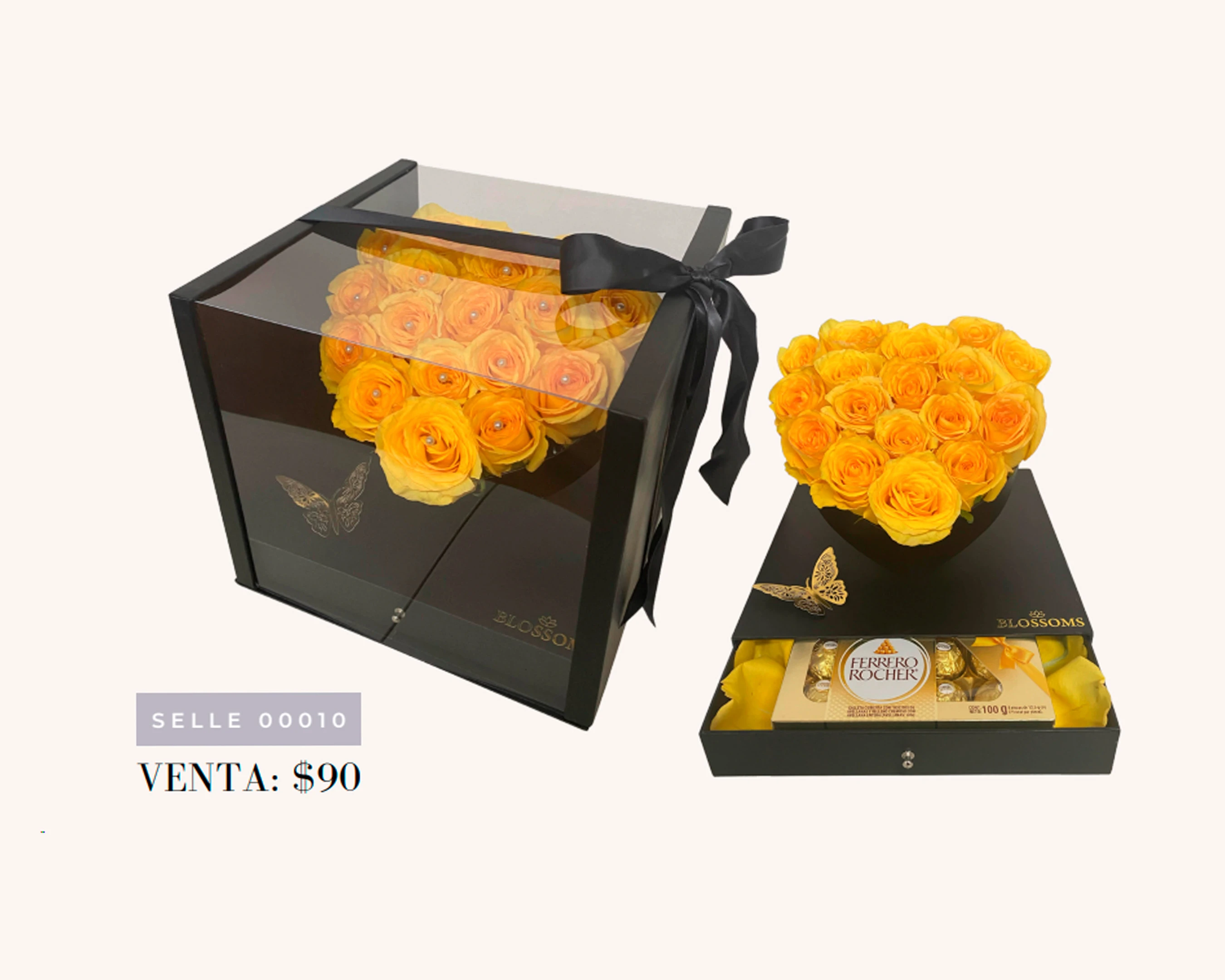 🌹💛 ACRYLIC YELLOW HEART | Elegancia, Dulzura y Detalle PremiumUn regalo exclusivo que combina la frescura de las rosas amarillas con la sofisticación de un empaque acrílico en forma de corazón. Ideal para sorprender en ocasiones especiales con un detalle único y memorable. ✨ Descripción del productoEl ACRYLIC YELLOW HEART BLOSSOMS es un arreglo floral de lujo presentado en una caja acrílica negra con paneles transparentes y forma de corazón. Incluye un bouquet de rosas amarillas frescas acompañado de pétalos decorativos. En la parte inferior, un cajón deslizable guarda chocolates Ferrero Rocher, creando una experiencia completa de elegancia y dulzura. El diseño se complementa con detalles dorados y un lazo decorativo, transmitiendo sofisticación y exclusividad. ✅ Ventajas del producto